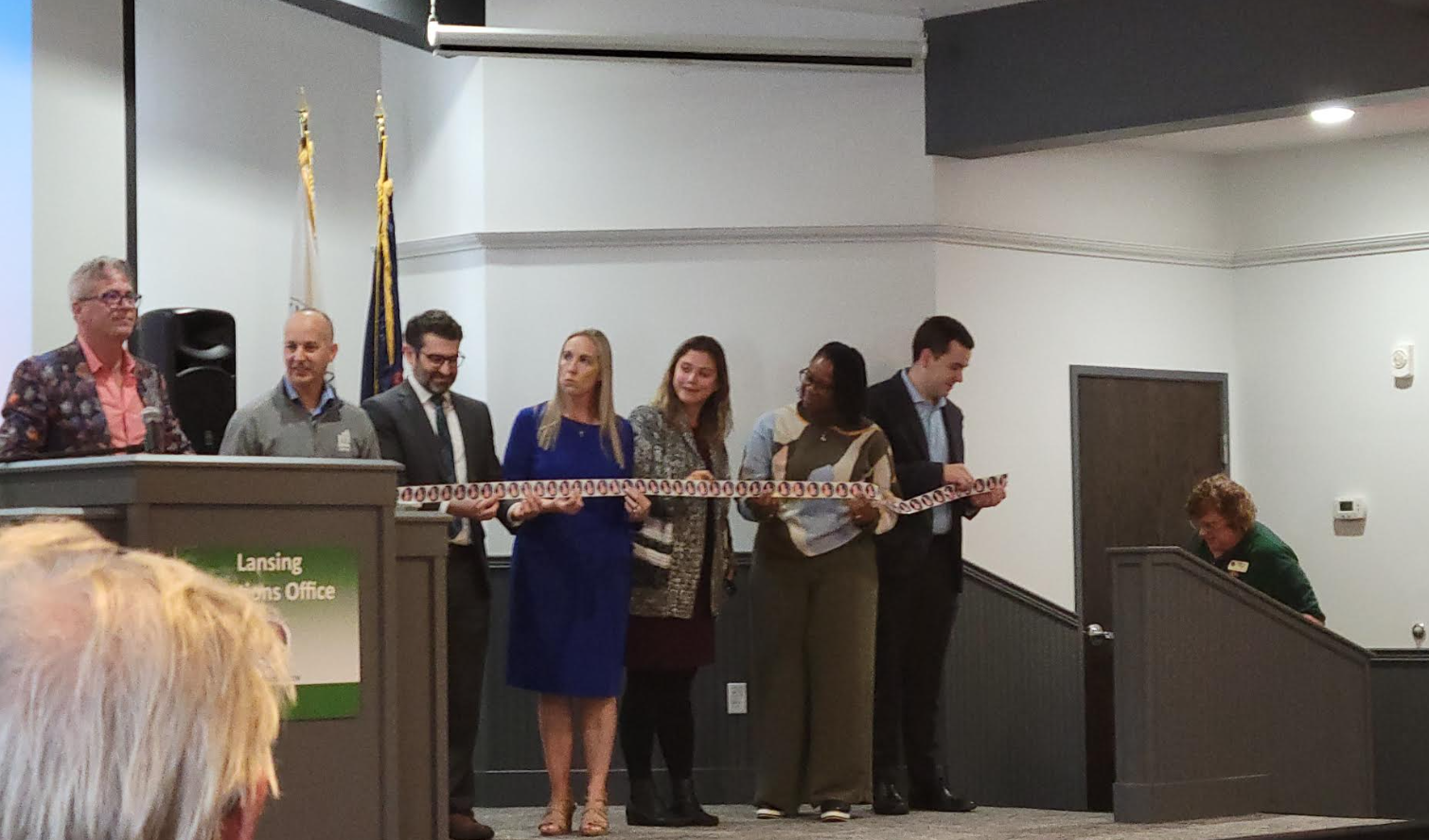 Participating in the ribbon cutting and offer brief remarks are State Sen. Sarah Anthony, Lansing Mayor Andy Schor, Michigan Secretary of State Elections Director Jonathan Brater, and other partners.